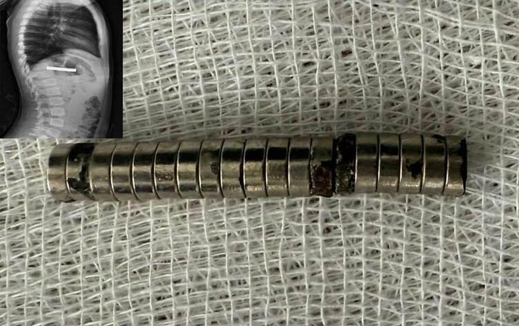 Endoskopik əməliyyatla maqnitlər uşağın boğazından çıxarılıb. Maqnitlərin bir-birinə yapışdığı və qida borusunu tıxadığı müəyyən edilib.